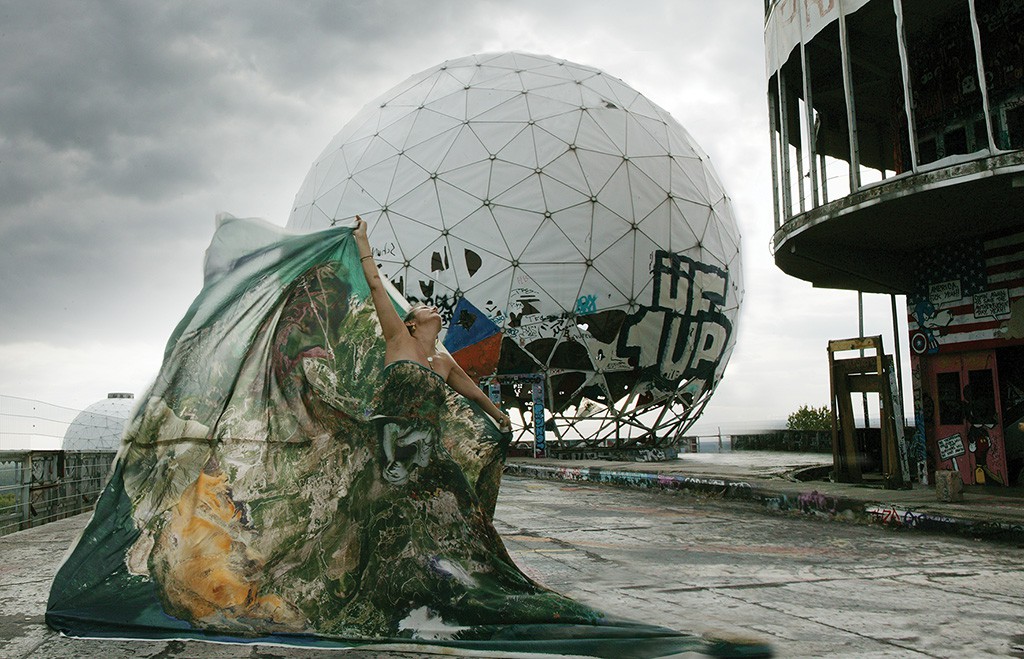 iLAND features the most imbalanced zones of our planet together with landscapes that have not experienced catastrophes in recent times. Aerial and topographic images are altered, painted, printed and combined in photomontage. The dress and sculpture became an island for discussion, a vehicle for communication and a fieldfor joint reflection. In the performance Regina Frank moved so slowly that the movement becomes only clear in time-lapse, as the effect of our behaviour often only becomes clear when we project into the future by analysing the past.