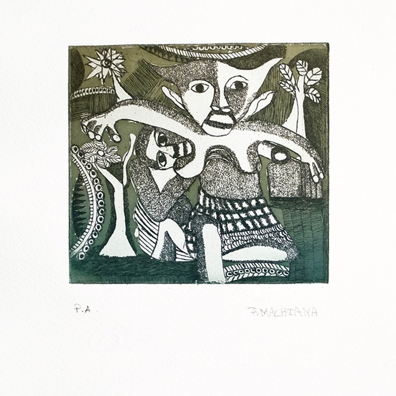 HOMENAGE TO THE MASTER If Malangatana knew how to impose the genius of an expression that sprang from the mythical and historical roots of a people, Fernando Machiana, drawing inspiration from the wisdom and authenticity of this lesson, would be a great example of this. plastic and poetic, created in his honor the song of a nationality that, like the great Mozambican artist, does not belong to any country, but to the ancestral and universal heritage ;nion of humanity.