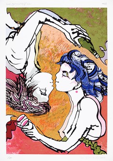 THE GAMES OF LOVE The dynamism and very vivid but harmonious colors give the two figures, female and male, in the silkscreen image by Marian Nowinsky, an atmosphere of celebration. represented by the chosen iconography, the glasses and the bottle that the man displays as if it were associated with the suggested party. It is certainly a love party, and a celebration of the love that nudity connotes. The game is always implicit in the lovers' meeting. present in the inversion of the figures.