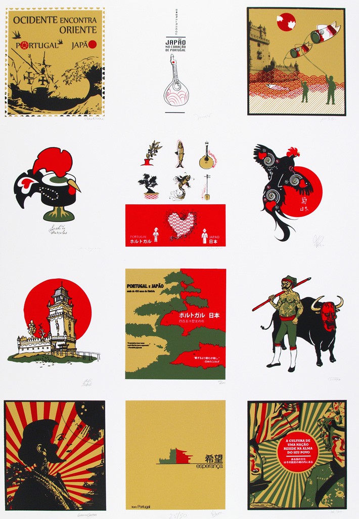 Screen printing designed by 12 Design Students from Iade selected for the JP_PT Project, which consisted of a Workshop at Atelier CPS in 2011, where students developed graphic work around the theme: Portugal/Japan - Cultural Contrasts, like their Japanese partners from Univ. Tokyo Polytechnic (KOOGEI Institute).