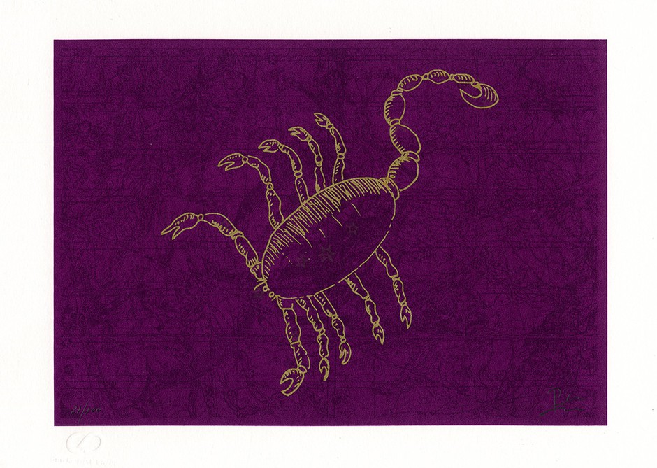 Based on an astronomical reference work, the Celeste Atlas by Flamsteed published in London in 1729, Pedro Martins presents each sign of the zodiac with the traditionally assigned color, regrouping across four distinct backgrounds, the elements of air, earth, water and fire.