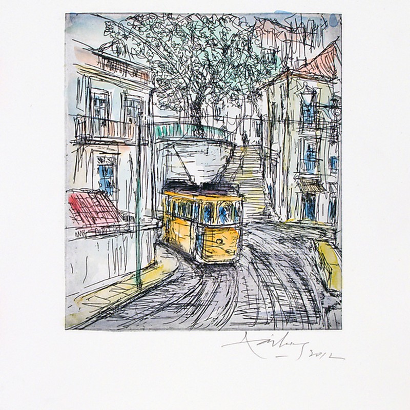 António Jorge Gonçalves, with a degree in Communication Design, completed his training in theater scenography in London and has been dedicating himself to theater design. illustration and political cartooning. The artist, who was born and lives in Lisbon, dedicated an image of great poetry to the city's most emblematic transport, the tram “called desire” in an evocation of the homonymous title of the famous film by Elia Kazan. In this composition, the logic of appearances gives place to another that obeys only the impulses of desire and the heart and the fantasies of dreams.
