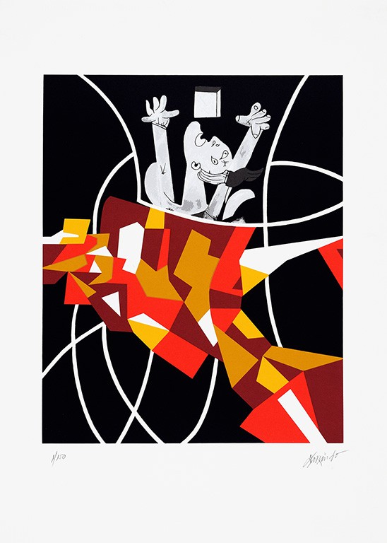 Love is painting, evoking a well-known title by Claude Roy, explains and summarizes not only the entire career of the great painter, and already historic illustrator, Dorindo de Carvalho (b.1937), but also one of the most interesting series of his paintings, which he titled “My Masters”, represented in these two silkscreens by Picasso and Matisse. About Picasso, unanimously considered the most emblematic artist of the 20th century and the inventor of Cubism, there will be little to say. to add that it is not common knowledge, the same happens with Matisse, who in the context of fauvism, gave the color plays a leading role in painting. Both are mentioned in these two splendid silkscreen creations. Picasso, in one of the figures from Guernica and Matisse in his vibrant dance, interpreted by Dorindo de Carvalho, himself a Master in the use of line, color, shape and geometry.