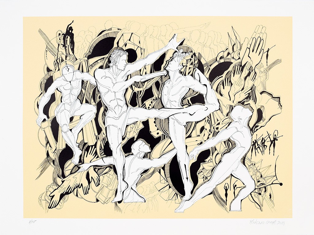 António Carmo has established himself throughout his plastic work, as one of the contemporary exponents of the lyrical tradition in Portugal, considered by a critic to be of the greatest importance. Rui Mário Gonçalves' science, defining our cultural identity, alongside what he calls “subtle art”, the ability to interrogate and transcend appearances. In his painting, the cult of form is associated with vibrant colors shining in contrasts of primary tones that the line contains without imprisoning, rather giving them lightness and density. In current silkscreen prints, the line, set against a blackness that accentuates its mystery, seems to capture the essence of a prodigious movement in eternal metamorphosis. A tribute to the dance and the talent of the star dancer António Casalinho who symbolizes it in this image with the beauty and perfection of his movements.