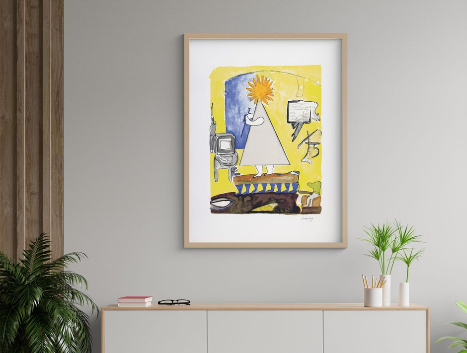 UNA FIGURA INOCENTE Y MÁGICA El arte de Mário Cesariny (1923- 2006), considerado con razón uno de los exponentes del surrealismo portugués tanto por su poesía como por su pintura, es uno de los ejemplos más importantes del surrealismo portugués. Es muy evidente, con un toque de humor, en este diálogo entre su escultura (representada por múltiples en dos variantes de color) y la imagen que creó para la serigrafía. Una figura a la vez inocente y mágica, que aúna el simbolismo del sol, como fuente de luz, conocimiento y vida, y el triángulo, emblema de la divinidad de la armonía y la proporción.