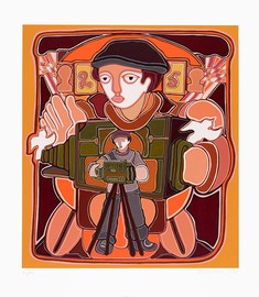 António Carmo (N. 1949) um dos pintores líricos mais emblemáticos do nosso país tem visto o seu trabalho impor-se igualmente num contexto internacional. Na serigrafia “Fotógrafo à la minute” retoma uma série de homenagens a figuras do imaginário popular que desenvolveu nos anos 80. Numa composição em que domina a habitual e forte presença da linha e do